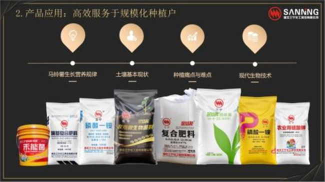 在產(chǎn)品研發(fā)領(lǐng)域,三寧化工深耕馬鈴薯主產(chǎn)區(qū),根據(jù)當(dāng)?shù)貧夂?、土壤、種植管理等特點(diǎn),結(jié)合現(xiàn)代生物技術(shù),推出了精準(zhǔn)適用于西北地區(qū)的金鈦能馬鈴薯12-19-16(含鋅、錳)專用肥及水肥一體化營養(yǎng)套餐等產(chǎn)品為馬鈴薯生長提供有力保障。